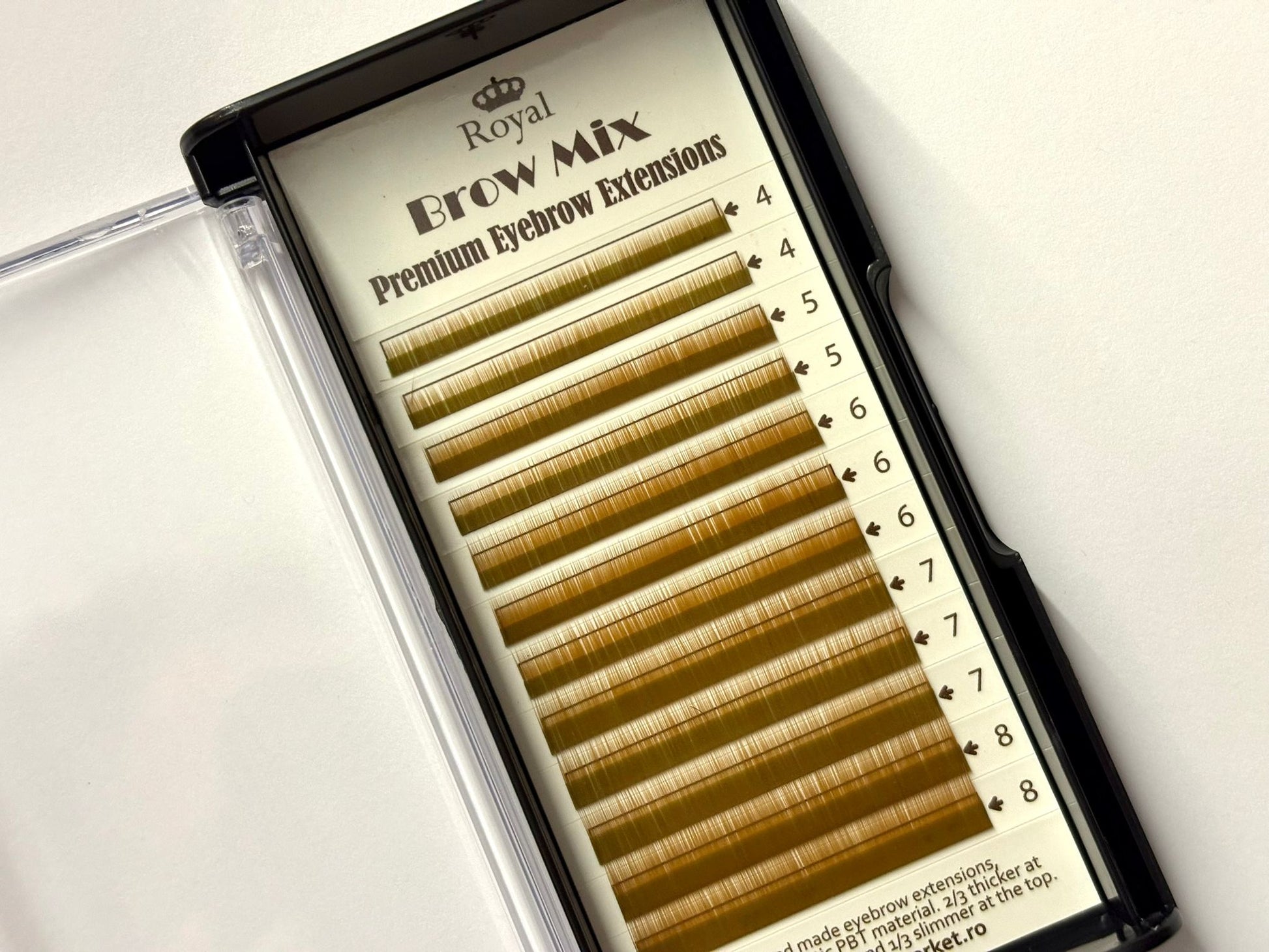 Mixul de extensii pentru sprâncene Royal Eyebrow Extensions Mix 0.15mm în culoarea maro deschis reprezintă o soluție ideală pentru stiliștii de sprâncene dornici să ofere clienților lor un aspect natural și îngrijit al sprâncenelor. Aceste extensii de înaltă calitate au o grosime de 0,15 mm și sunt disponibile în lungimi variate, de la 4 mm până la 8 mm.